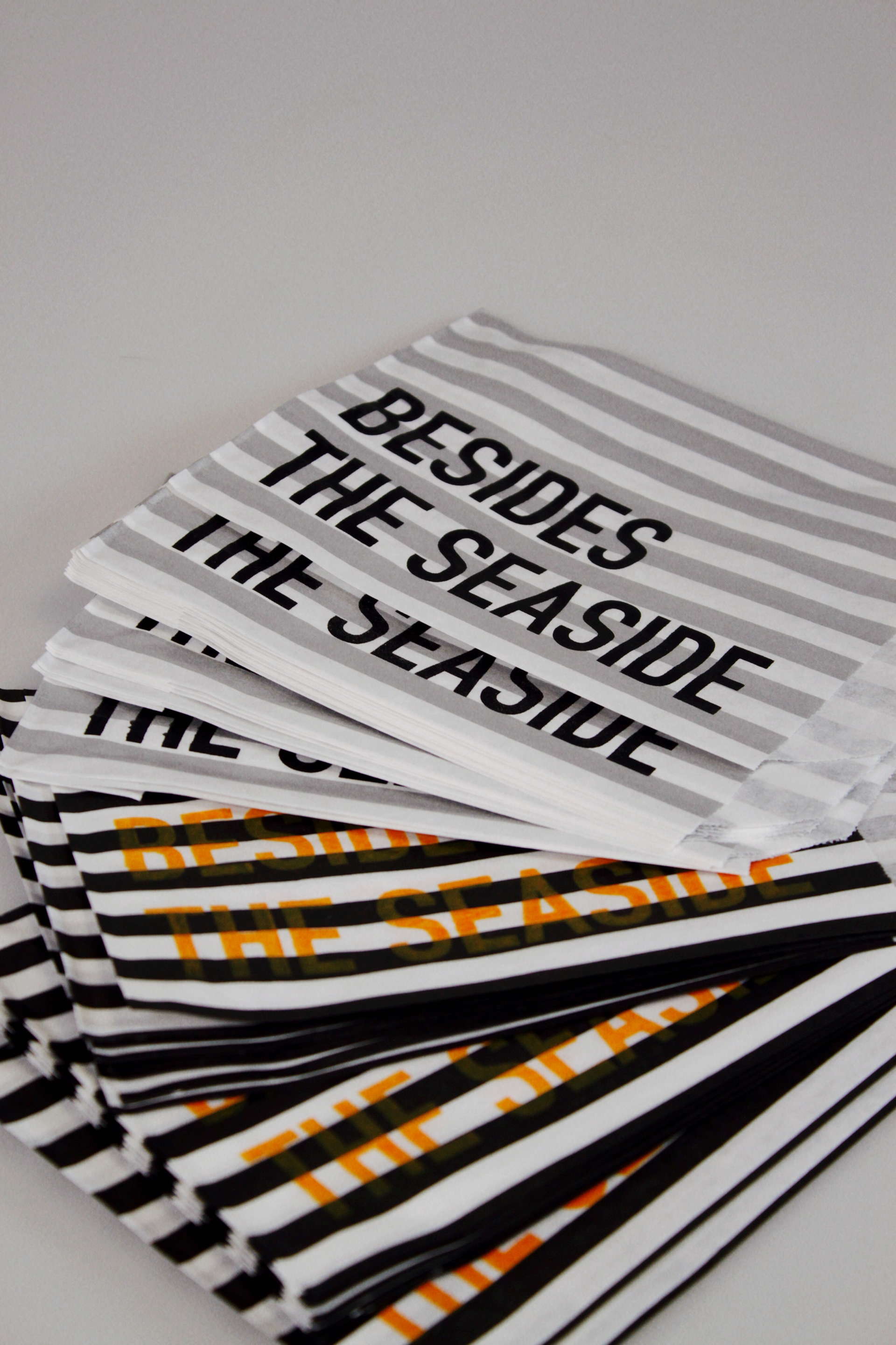 The accompanying use of candy-cane paper bags replicates those commonly received in souvenir shops. The publication title has been screen-printed onto the bags and a selection of postcards showcase screen-printed juxtaposing quotations. The simple act of sending and receiving the postcards will highlight the two-sided stories towns and cities can have.