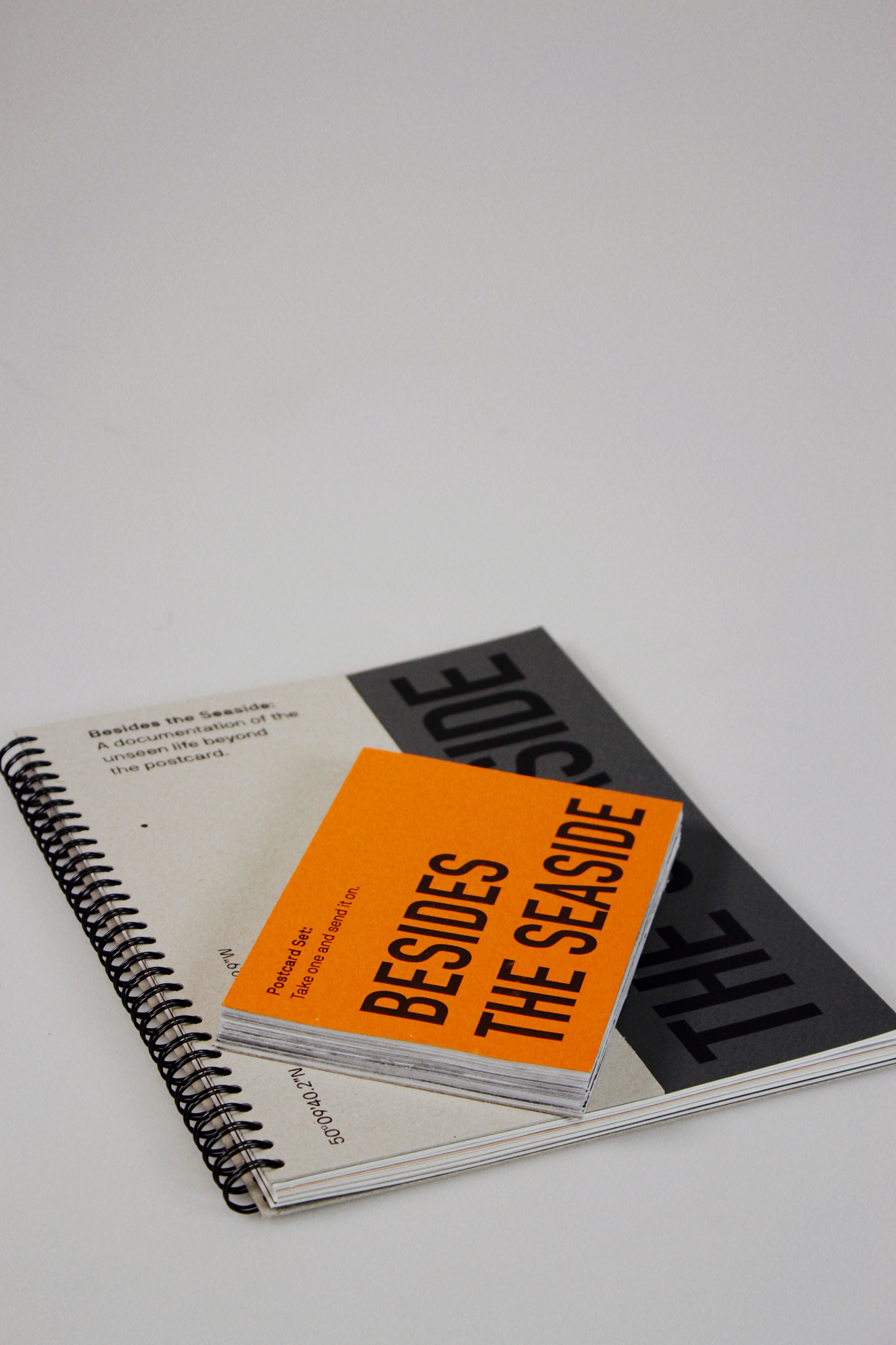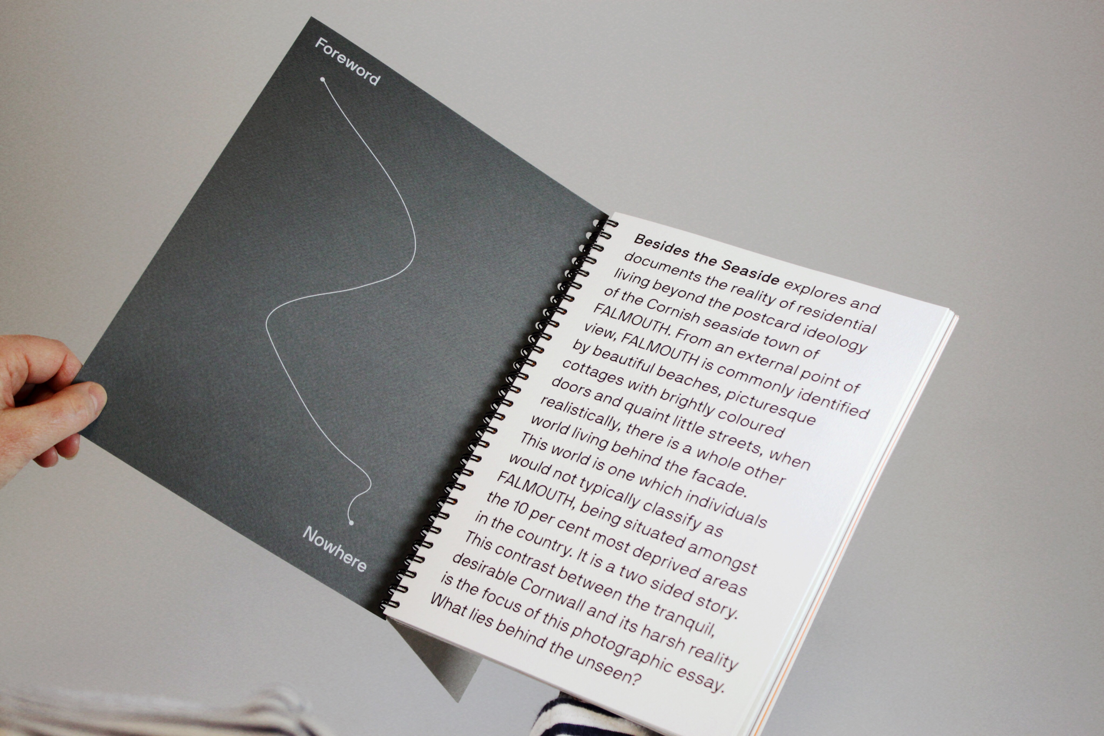 The title ‘Besides the Seaside’ mimics the well-known song ‘Beside the Seaside’, however with the adjustment of words, the meaning is altered and aligns with the photographic message, supported by the cover. The grey-board cover attempts to emulate the durable and convincing facade in which Falmouth holds to its external viewers. This strong reputation of picturesque beaches, beautiful cottages and vibrant streets of Cornwall, blocks the undesirable, deprived areas from view. The reader is initially blind of to the full title, however upon the turn of the page, is revealed. The title is fully exposed with 'besides' physically positioned besides 'the seaside' and hidden behind the metaphorical facade, suggesting the individual experiencing the unseen neighbourhoods of Falmouth.